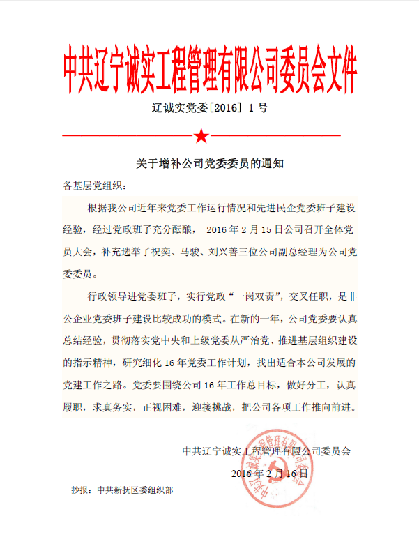 中共遼寧誠(chéng)實(shí)工程管理有限公司委員會(huì)文件——關(guān)于增補(bǔ)公司黨委委員的通知