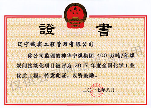 我單位所監(jiān)理的《神華寧煤集團(tuán)400萬噸/年煤炭間接液化項(xiàng)目》被中國(guó)化學(xué)施工企業(yè)協(xié)會(huì)評(píng)為2017年度全國(guó)化學(xué)工業(yè)優(yōu)質(zhì)工程獎(jiǎng)。在此次評(píng)選中,共有81項(xiàng)工程、178個(gè)單位及156名突出貢獻(xiàn)者獲得表彰。此次,是我單位時(shí)隔4年第二次獲得該獎(jiǎng)項(xiàng)殊榮。