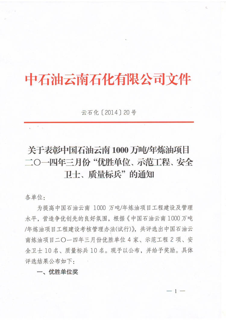 我公司榮獲中國石油云南1000萬噸/年煉油項(xiàng)目2014年3月份“優(yōu)勝單位”稱號