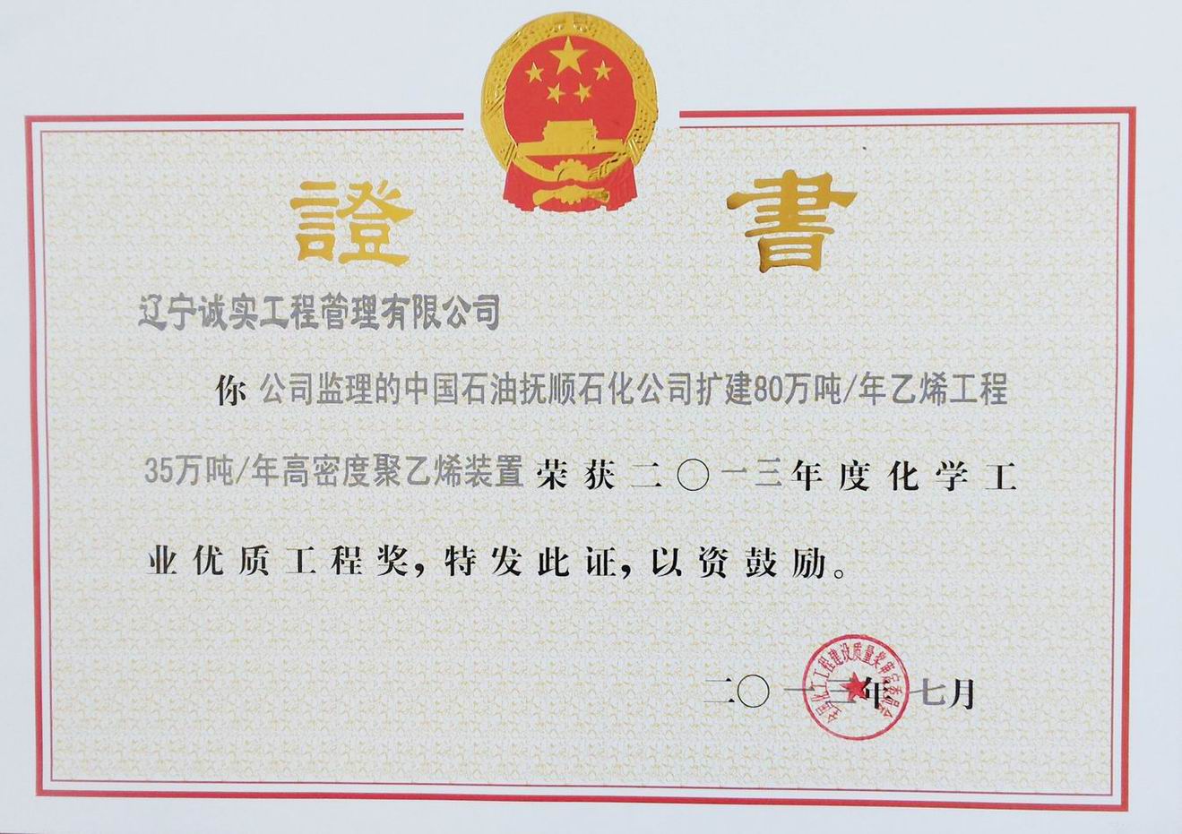 2013年化學(xué)工業(yè)優(yōu)質(zhì)工程獎(撫順石化擴建)