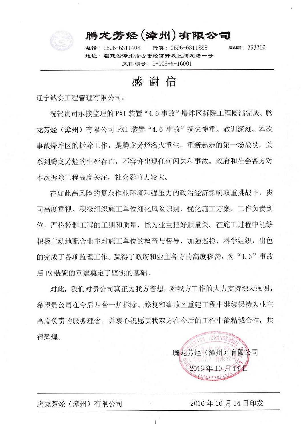 我公司監(jiān)理人員在“騰龍芳烴(漳州)有限公司PXI裝置4.6事故爆炸區(qū)拆除”工程監(jiān)理服務工作中,得到了業(yè)主單位的認可和肯定,對我們的工作表示十分滿意,特發(fā)感謝信提出表揚。