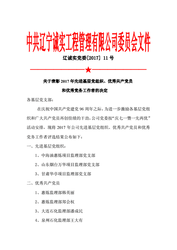為慶祝中國共產(chǎn)黨建黨96周年,公司黨委于2017年6月30日下午在公司一樓會議室召開了慶祝建黨96周年暨“一優(yōu)兩先”表彰視頻大會。公司機關(guān)、撫順各項目監(jiān)理部及在撫的黨員同志在主會場參加了大會,中海油惠州項目監(jiān)理部黨支部、甘肅華亭項目監(jiān)理部黨支部、寧夏石化項目監(jiān)理部黨支部、中化泉州項目監(jiān)理部黨支部、廣西石化項目監(jiān)理部黨支部、蘭州石化項目監(jiān)理部黨支部、內(nèi)蒙古君正項目監(jiān)理部黨支部、神華寧煤項目監(jiān)理部黨支部、煙臺萬華項目監(jiān)理部黨支部設立視頻分會場。黨委委員馬駿主持了視頻大會。首先,公司黨委副書記馮玉琢同志宣讀了“一優(yōu)兩先”表彰決定。接著,黨委書記孫學良結(jié)合公司實際做了慶祝建黨96周年的講話。最后全體黨員重溫的入黨誓詞,進行入黨宣誓。