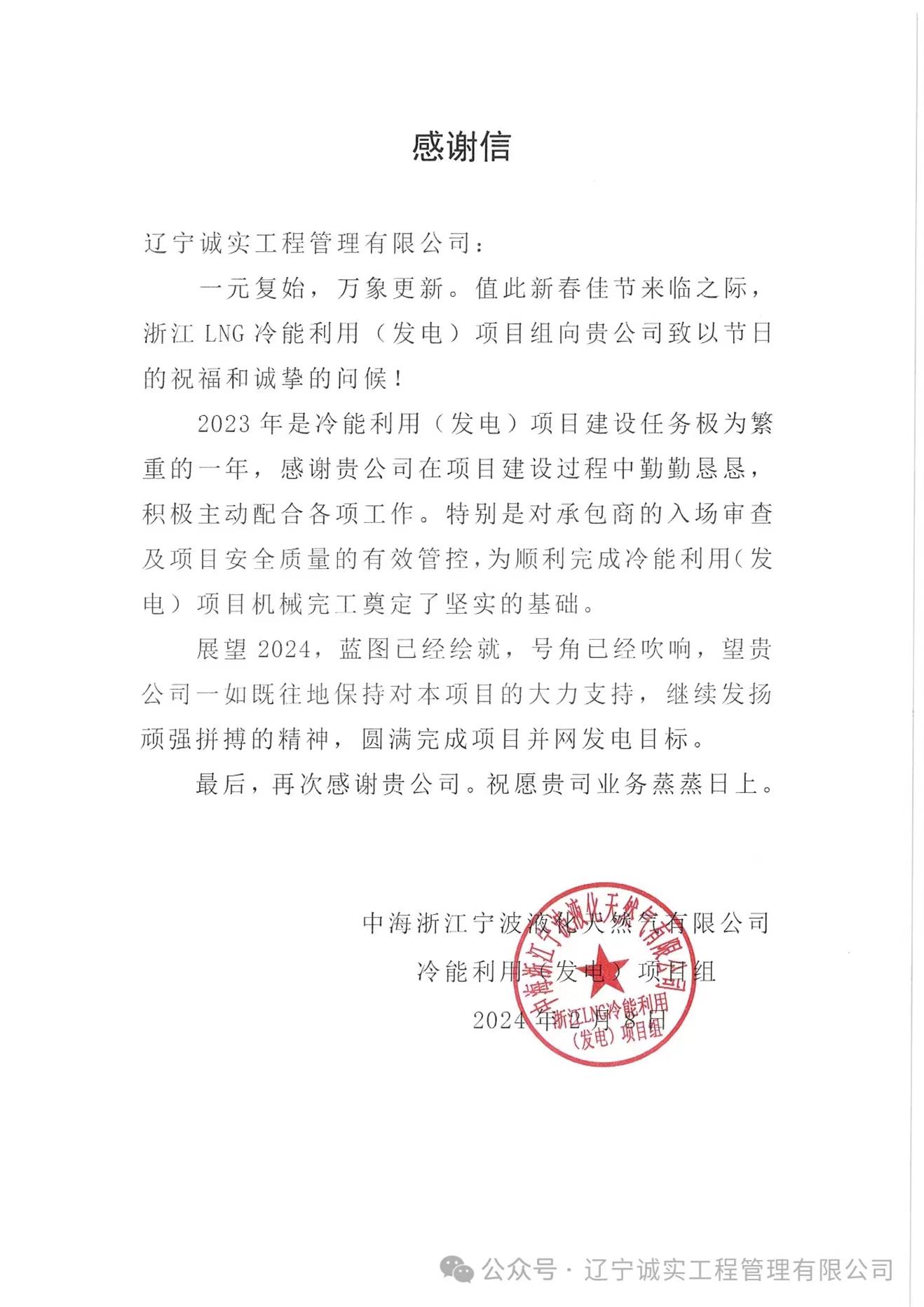 浙江LNG冷能利用(發(fā)電)項目組向公司發(fā)來了感謝信,信中肯定了公司項目部人員在2023年的努力,特別是對于承包商入場審查及項目安全質(zhì)量的有效管控,為項目機械完工奠定了堅實的基礎(chǔ)。該項目是積極響應(yīng)國家及浙江省“十四五”規(guī)劃的節(jié)能減排政策,落實“綠色低碳”發(fā)展戰(zhàn)略的示范項目,項目投產(chǎn)后,預(yù)計年凈發(fā)電量約為2408萬度,節(jié)省標準煤超3000tce,年減少CO₂排放可達18000多噸。展望2024年,項目部在黃思敏總監(jiān)的帶領(lǐng)下,將認真執(zhí)行監(jiān)理職責,積極推進項目建設(shè),爭取項目早日建成投產(chǎn)。