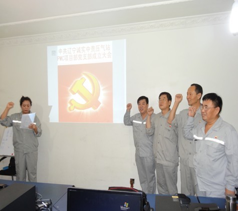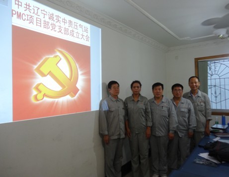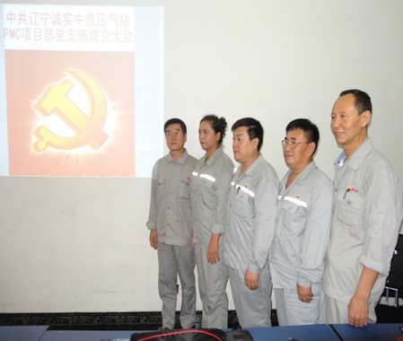 2013年7月21日遼寧誠(chéng)實(shí)中貴線壓氣站PMC項(xiàng)目部黨支部成立大會(huì)正式召開(kāi),大會(huì)由公司黨委委員趙樹(shù)環(huán)同志主持,首先介紹了了黨支部成立的意義和目的,然后進(jìn)入了大會(huì)流程。通過(guò)全體黨員民主評(píng)議、選舉,盛孝福同志當(dāng)選為PMC項(xiàng)目部黨支部書記,師興華同志當(dāng)選為黨支部組織委員,胡德林同志當(dāng)選為黨支部宣傳委員,趙樹(shù)環(huán)同志代表公司黨委對(duì)黨支部成立表式祝賀。黨支部全體黨員在黨旗下進(jìn)行了鄭重宣誓,最后由黨支部書記作表態(tài)發(fā)言。