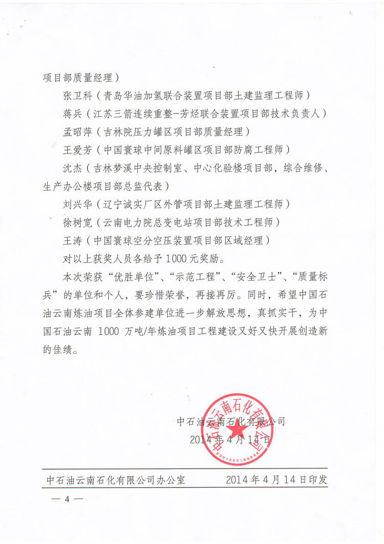 我公司榮獲中國石油云南1000萬噸/年煉油項(xiàng)目2014年3月份“優(yōu)勝單位”榮譽(yù)稱號!
