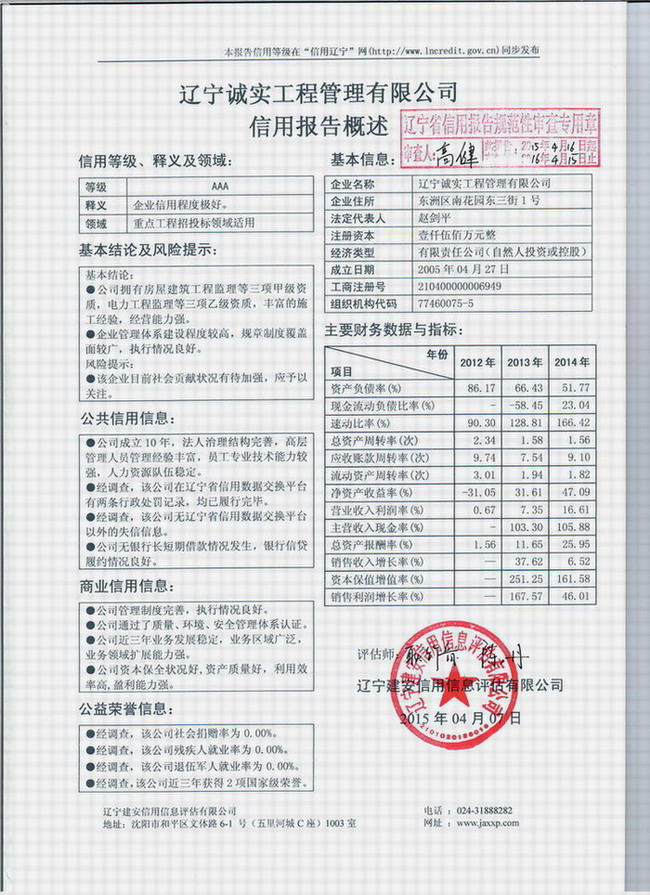 2015年4月,經(jīng)遼寧建安信用信息評估有限公司信用評級委員會的評定,我公司被確定為最高信用等級“AAA”級。
